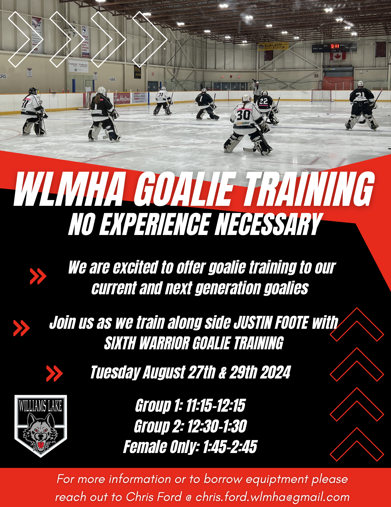 WLMHA is holding a Goalie Training Clinic with Justin Foote and Sixth Warrior Goalie Training on Aug 27 and Aug 29 for a small fee of $10.00/both sessions